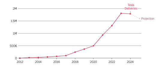 特斯拉2024年交付的汽车数量少于2023年,这是其首次出现年度下降。分析人士预计,今年的降幅甚至会更大